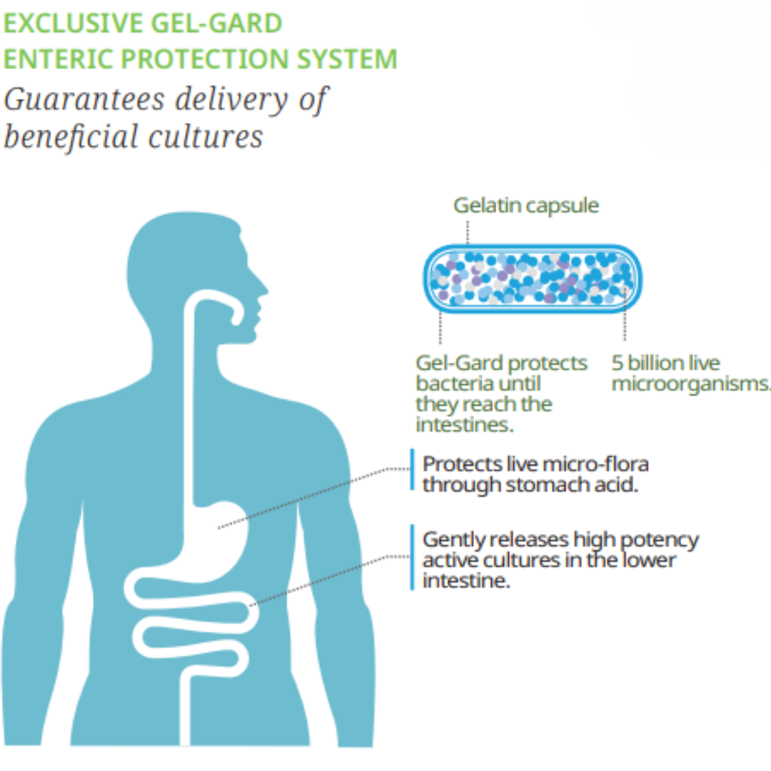 Our exclusive Targeted Delivery Technology (Gel Gard) protects the bacteria from the harsh, acidic environment of the stomach and maximises the number of live bacteria that reaches the intestines.