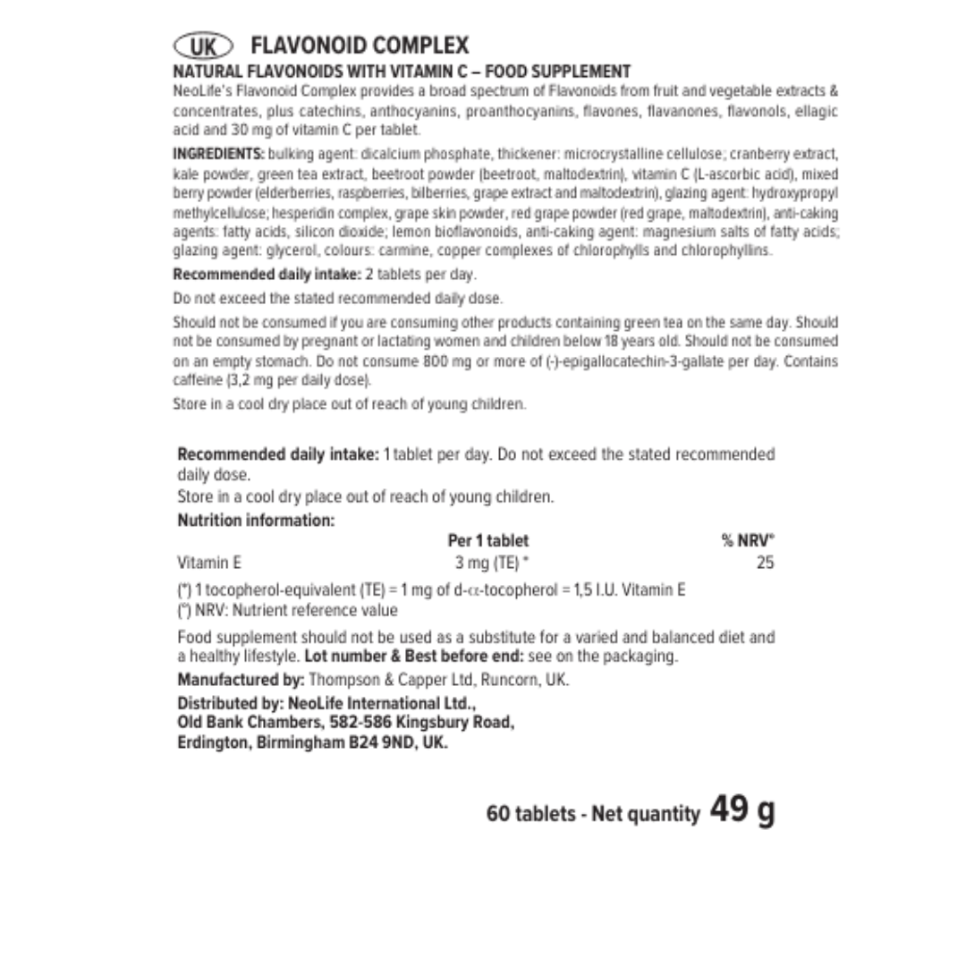 Each tablet provides the phytonutrient value of an optimal serving of flavour-rich fruits and vegetables. Furthermore, the ingredients in Flavonoid Complex meet the recommended daily intake of 6 - 7 servings of fruits and vegetables.