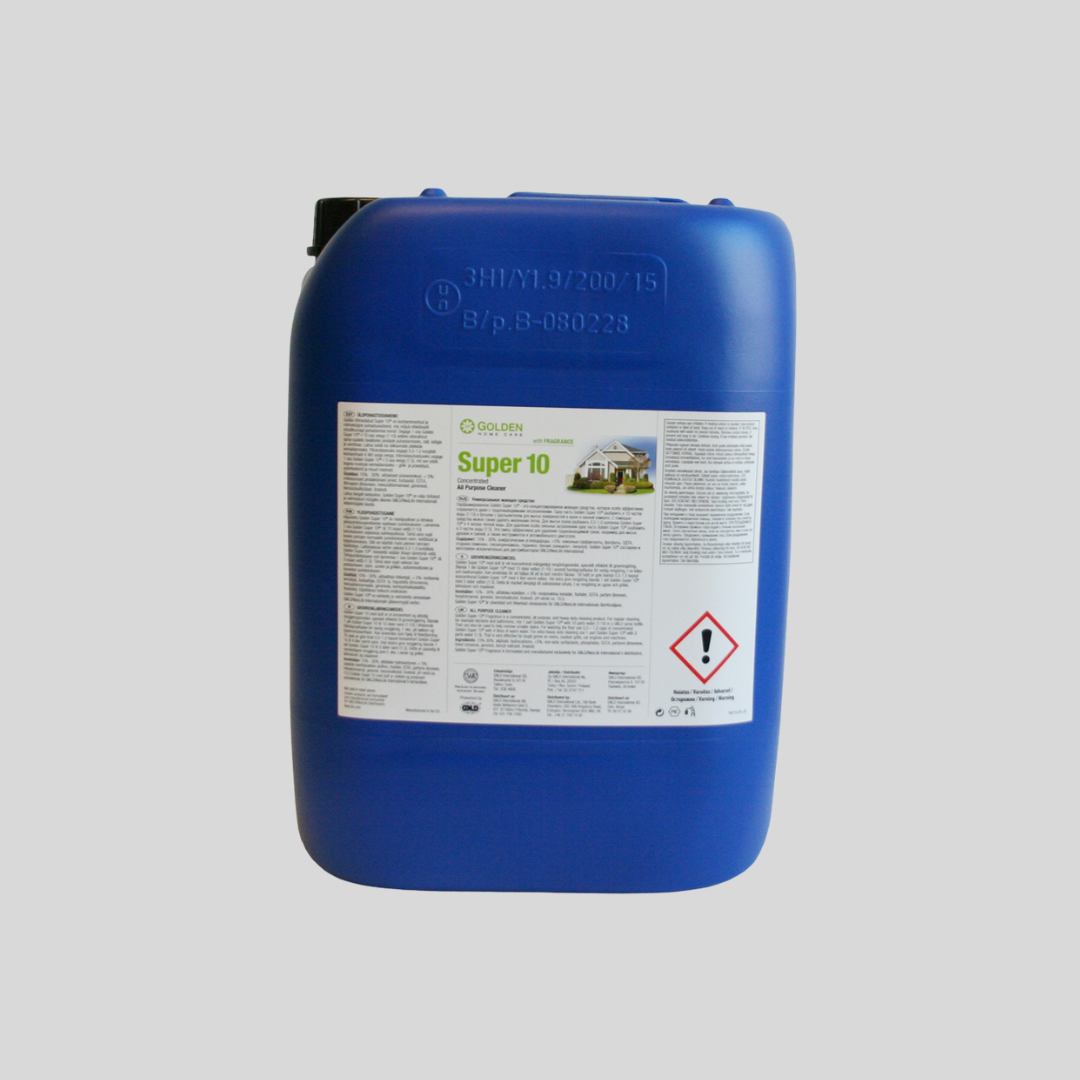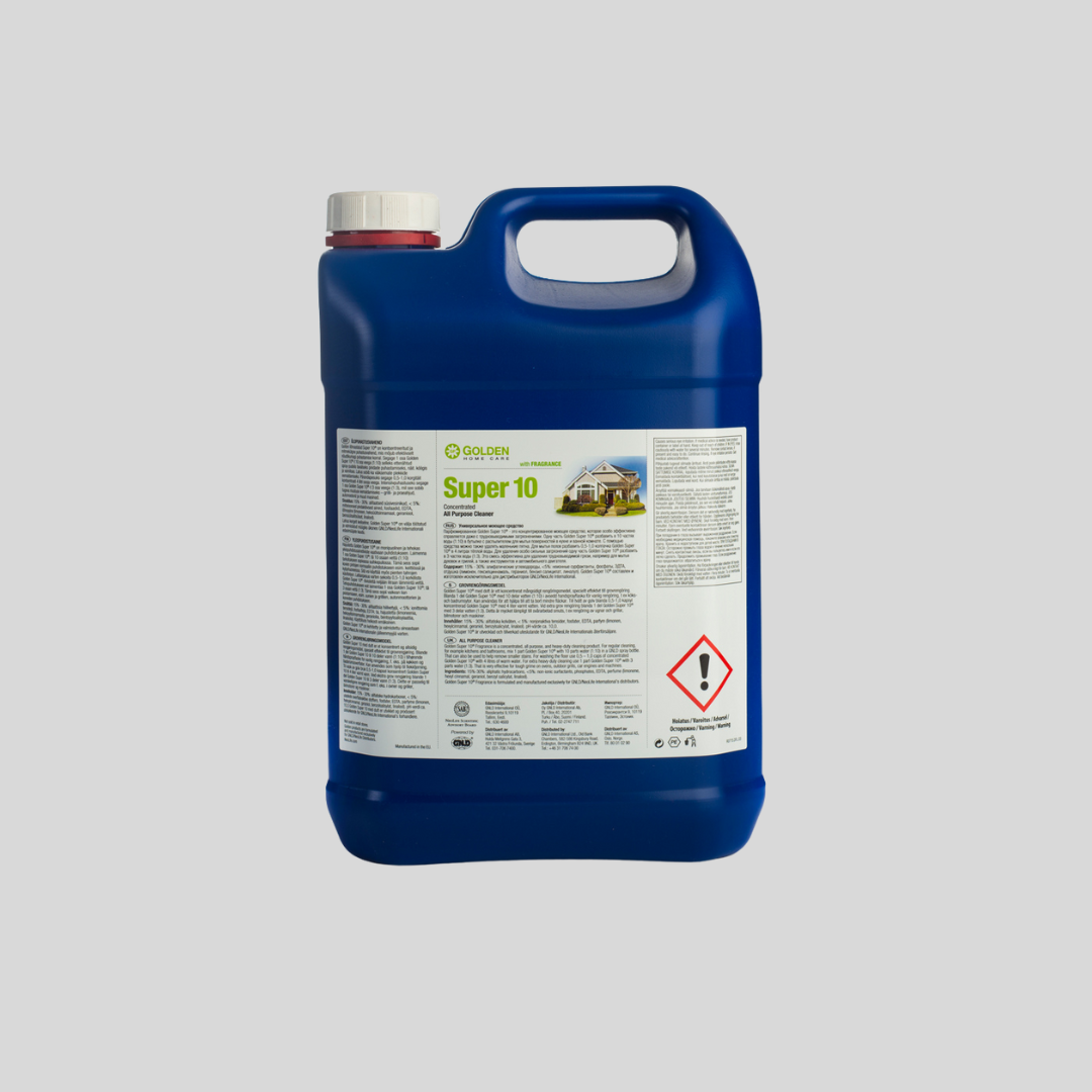 Super 10 all-purpose cleaner is Golden's most powerful cleaning product. Furthermore, industrial-strength Super 10, penetrates and emulsifies even the toughest of dirt and grime. It is perfect for industrial use, yet safe in the home. Super 10 makes all your cleaning chores easier, yet it is compatible with the environment. You will love the way it penetrates grease and stains, wipes out fingerprints, black heel marks and soapy residue on file and grout. You choose the strength you need for each cleaning task. It is powerful cleaning for just pennies per use
